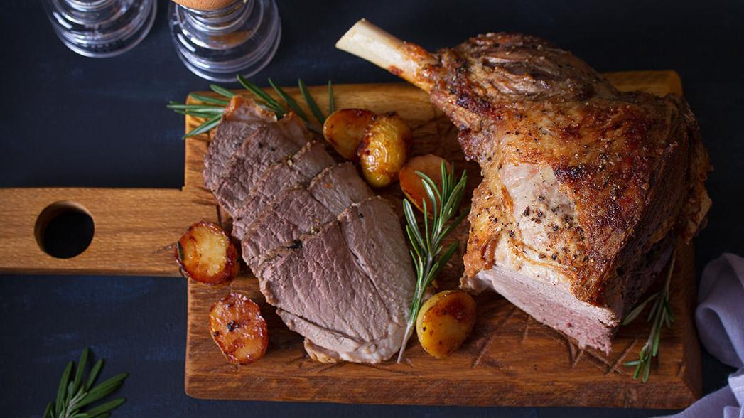 Cut slits in lamb; insert garlic. Rub meat with salt, pepper and oregano. Roast at 400° for 30 minutes. Reduce heat to 350°; roast 1 hour more.