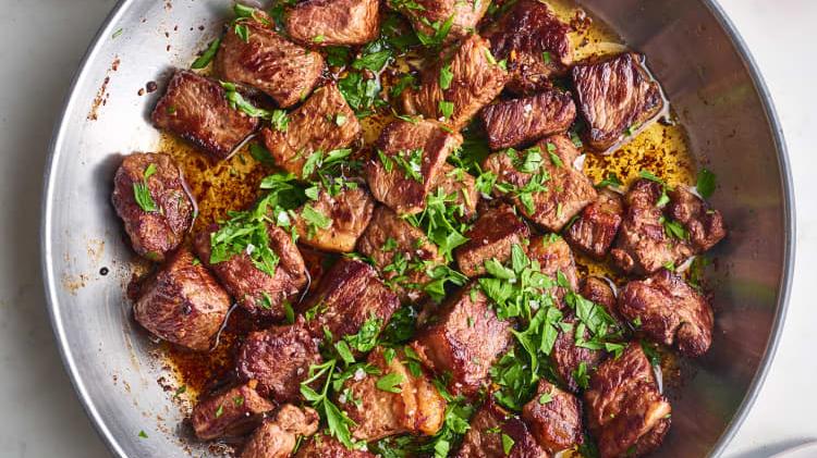 Use the widest nonstick skillet or pan you’ve got to bring a stick of butter to a simmer, then add the steak bites — cubes of New York strip steak — to the hot butter. The garlic gets added after the steak is nicely seared so that it doesn’t burn. Serve these bites over mashed potatoes or buttered noodles, or alongside a simple arugula salad for dinner.